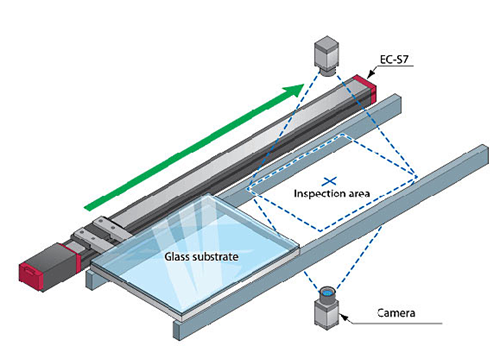 ELECYLINDER® EC-S7 överför glassubstrat medan kamerorna utför inspektion från topp till botten samtidigt.